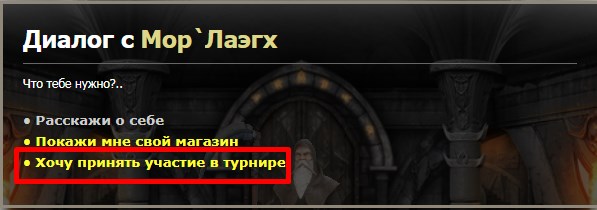 Турнир в Башне Смерти Это уникальный турнир в котором может принять участие неограниченное количество игроков, чем больше участников тем больше призовой фонд. Начало турнира в 20:00 (ежедневно). Как подать заявку на участие в турниреВ 19:00 по серверу, в чате появляется системное сообщение: Внимание! Через 60 минут начнется турнир в Башне Смерти. - это означает то, что у вас есть 1 час для того, чтобы подать заявку, для этого необходимо зайти в Башню Смерти которая расположена в нижней части города и начать диалог с Мор`Лаэгх, в ходе диалога выбрать раздел: Хочу принять участие в турнире.